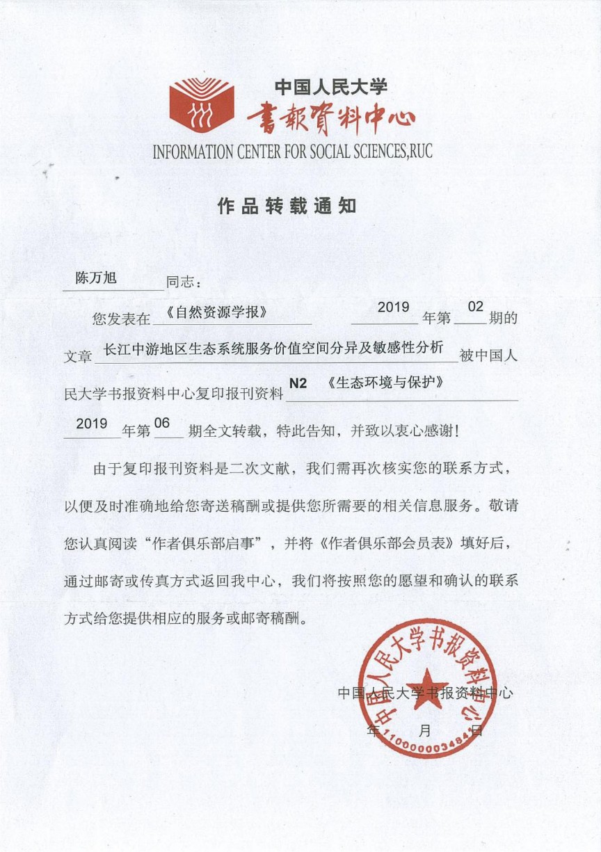 (通讯员 向敬伟)公司土地资源管理专业博士生陈万旭发表于《自然资源学报》期刊2019年第2期的论文“长江中游地区生态系统服务价值空间分异及敏感性分析”,被中国人民大学书报资料中心复印报刊资料《生态环境与保护》2019年第6期全文转载,通讯作者为李江风教授。