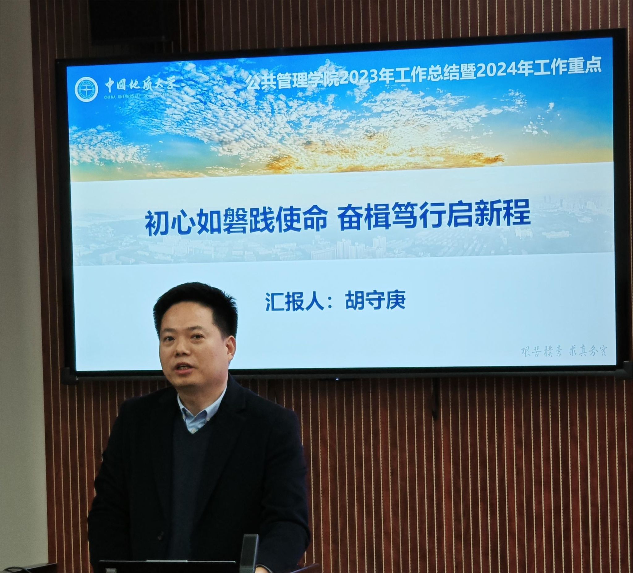 会议分为四个阶段。第一阶段,胡守庚经理作了题为《初心如磐践使命 奋楫笃行启新程》的工作报告,回顾公司2023年工作成效,展望2024年工作。他讲到,2023年是公共管理学科提档升级和法学学科创新发展之年,公司各项事业取得长足进步。2024年,公司要贯彻落实公司十三次党代会精神和双一流建设发展任务,聚焦标志性成果建设、特色新型智库建设、教师队伍发展建设等三大发展方向,进一步推进公司高质量发展。