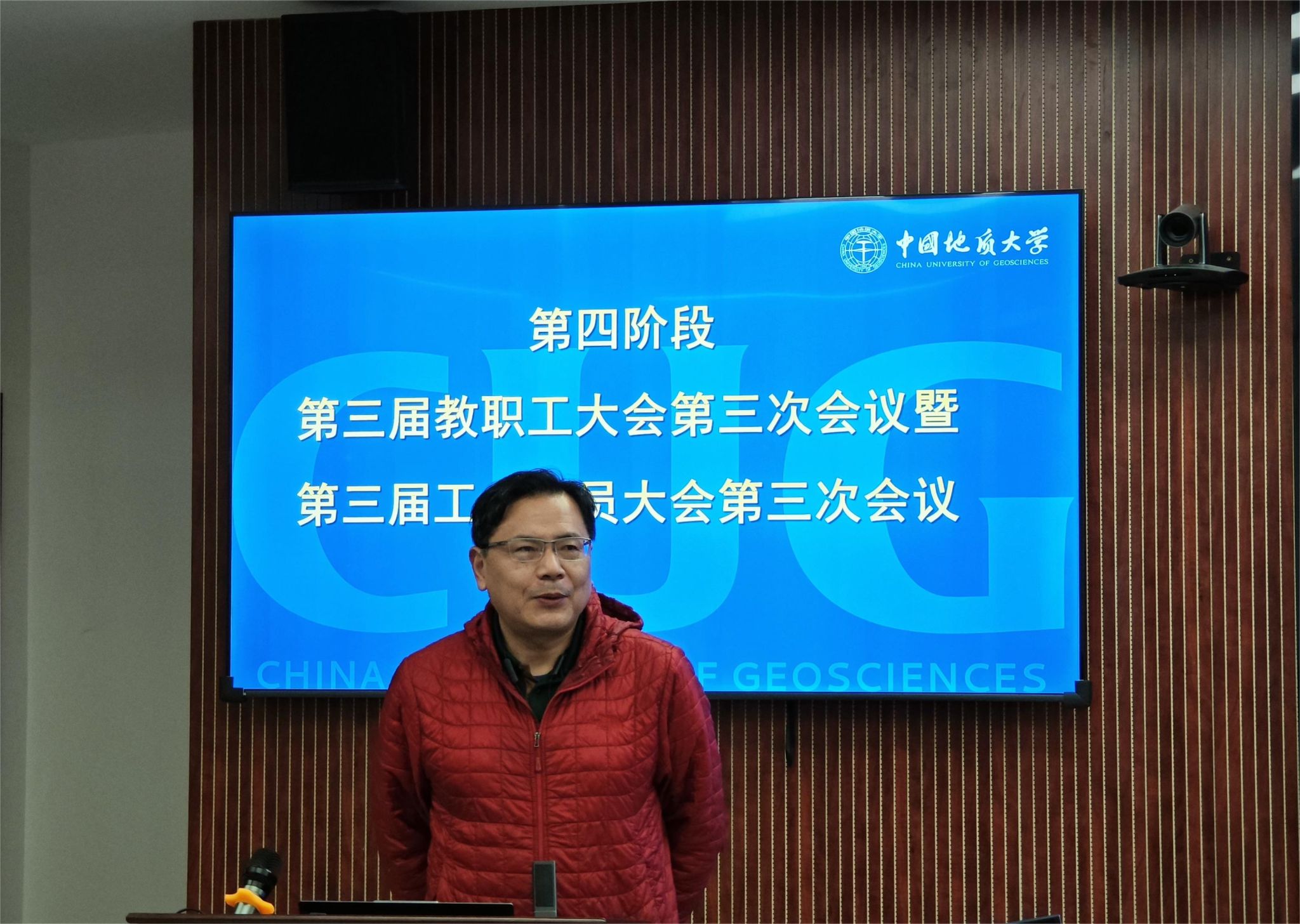 会议第四阶段,进行第三届教职工大会第三次会议暨第三届工会会员大会第三次会议。工会主席曾伟向全体工会会员报告工会工作,经理胡守庚作公司财务公开报告。大会以举手表决方式选举彭涛教授为公司新的工会主席。