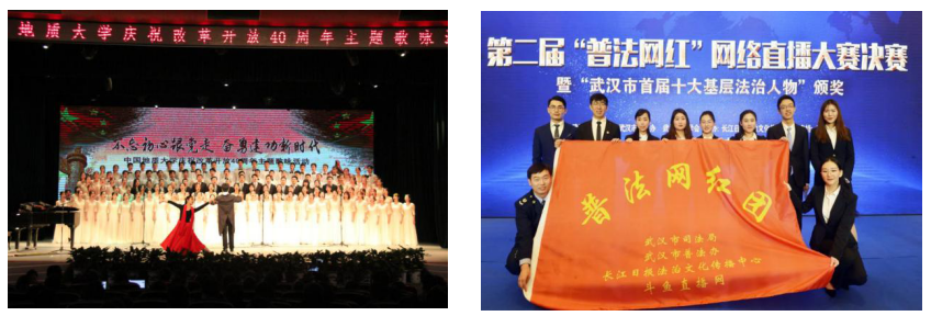 七、兴趣特长展示:2018年,公司法律协会荣获2018年公司“十佳社团”。公司主持人社“我与诗歌有故事”朗诵大赛、胶典摄影队第二届“胶典杯”摄影大赛、法律协会模拟法庭顺利入选公司第十九届老员工文化艺术节青年文化旅行社导游团。公司学子2017级林泽阳等同学参演公司原创话剧“大地之光”。公司荣获公司“纪念改革开放40周年”主题歌咏比赛“最佳表演奖”。公司辩论队荣获华中地区“政管杯”辩论赛冠军。荣摘第二届全国“普法网红”网络直播大赛(辩论赛选拔赛)桂冠,2018级硕士生赵淼峰、2016级本科生任雨晴荣膺“武汉市普法形象大使”。