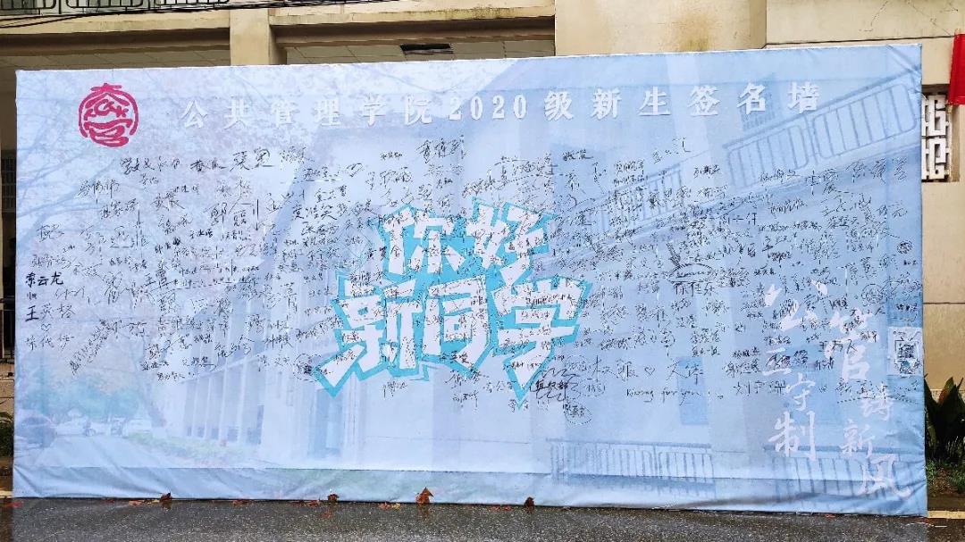 新生完成报到手续后,纷纷在公管公司的定制签名墙上留下自己的名字并合影留念。