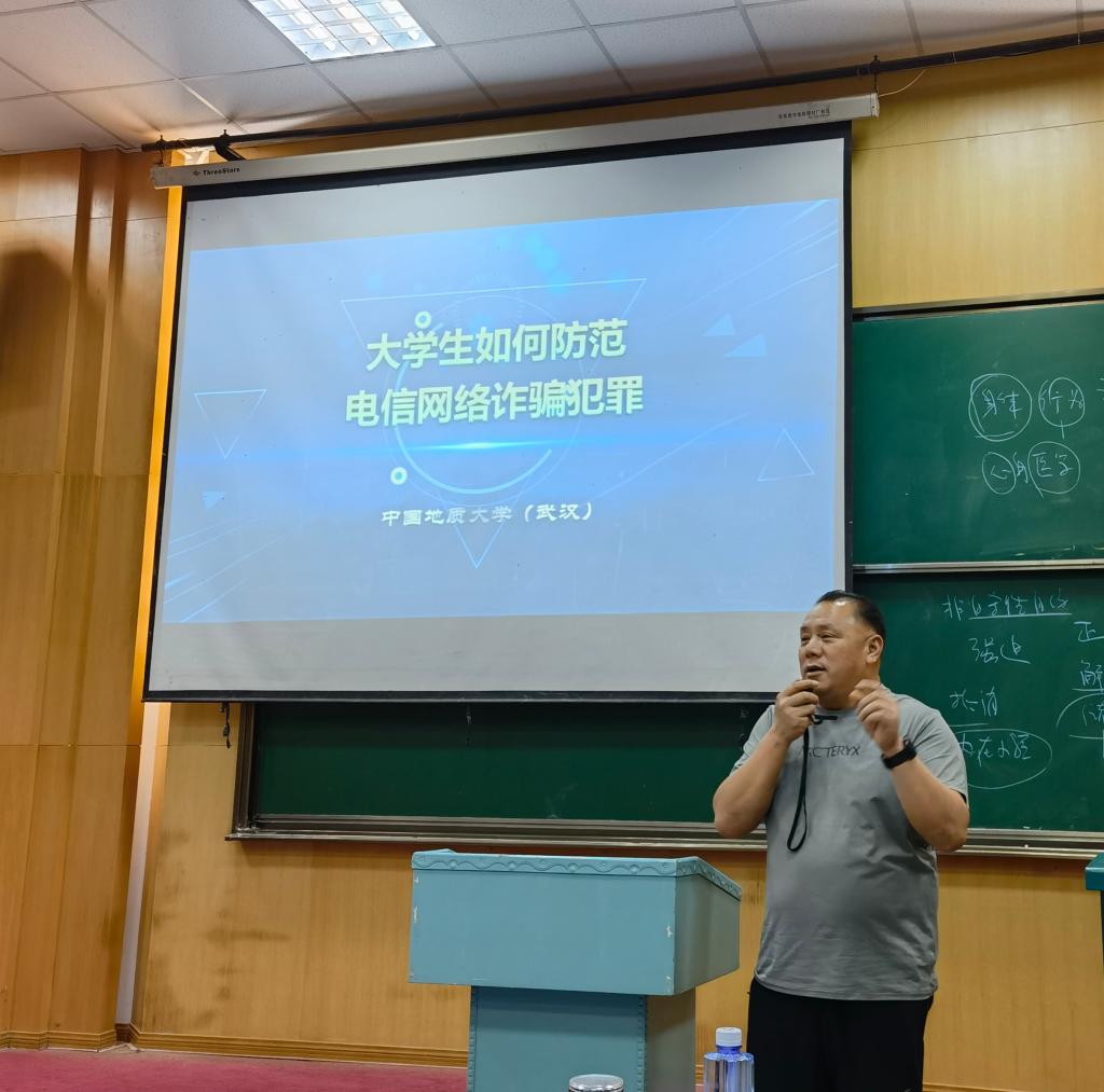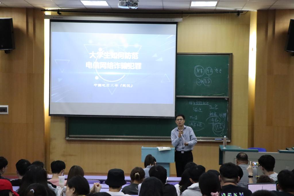 之后,单处长大力提倡同学们认真学习“地大保卫”提供的网上防诈骗课程,相信大家学完以后一定大有收获。最后,单处长强调,如果遇到诈骗,不要慌张,要及时向老师和公司反映,及时报警,并以一句话作为总结——“绷紧防范弦,捂紧钱袋子”。