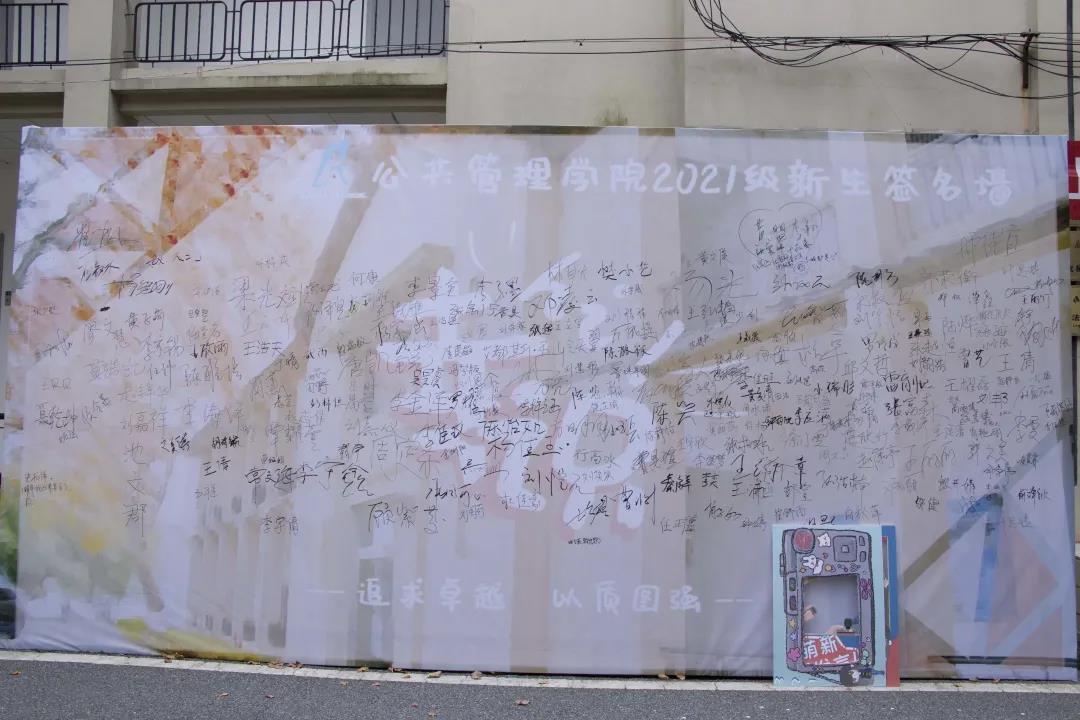 新生们完成报到手续后,纷纷到专属公管公司的签名墙上留下自己的名字并合影留念。