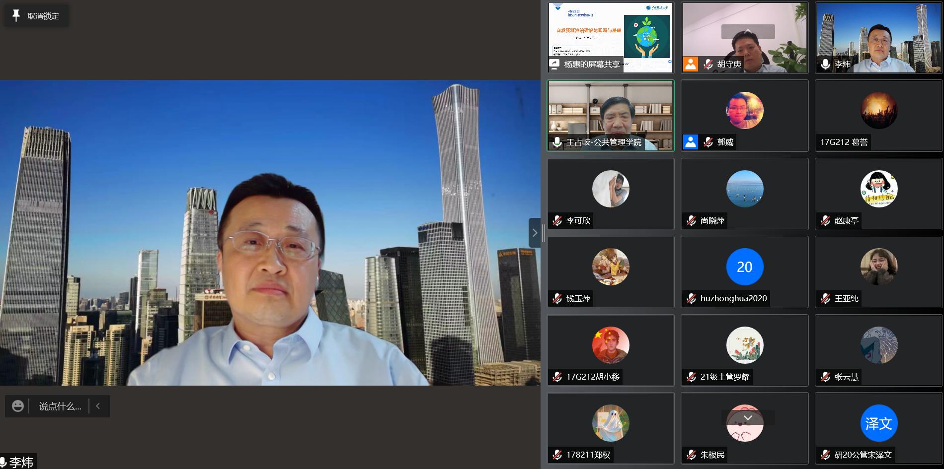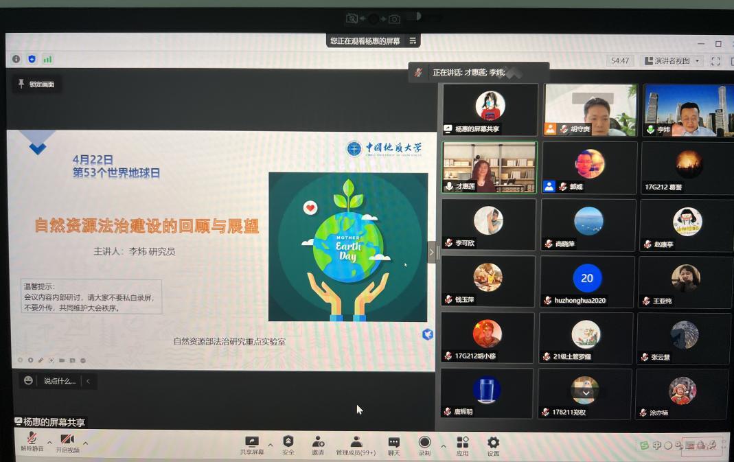 4月22日是第53个世界地球日,为深入学习宣传贯彻习近平生态文明思想,自然资源部法治研究重点实验室、best365英国体育在线成功举办“422地球日”专题线上研讨会。公司党委副书记唐辉明出席会议并致辞,自然资源部不动产登记中心(法律事务中心)副主任李炜以“自然资源法治建设的回顾与展望”为主题作专题报告,公司公管公司师生、自然资源部不动产登记中心相关人员参加了此次学术活动。best365英国体育在线经理胡守庚主持会议。
