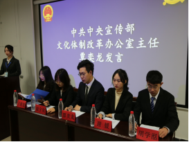 最后,曾伟教授从内容和形式两方面做了总结,指出模拟新闻发言人训练是对同学们综合素质的检验与锻炼,对沟通表达能力和临场灵活应变能力要求非常高。希望同学们以后都能当所在单位的代言人和发言人。因此建议同学们要加强新闻内容背景的挖掘和新闻内容发布的精准,同时注意模拟角色扮演时的代入感和舞台表演的创新。在形式上要注意桌签摆放细节,国徽党徽的使用以及文本格式的规范性等。