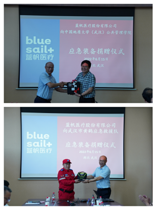 随后,黄鹤救援队总队长邓明锋、公司党委书记张宽裕分别接受了蓝帆医疗捐赠的AED除颤仪和全系列急救包。