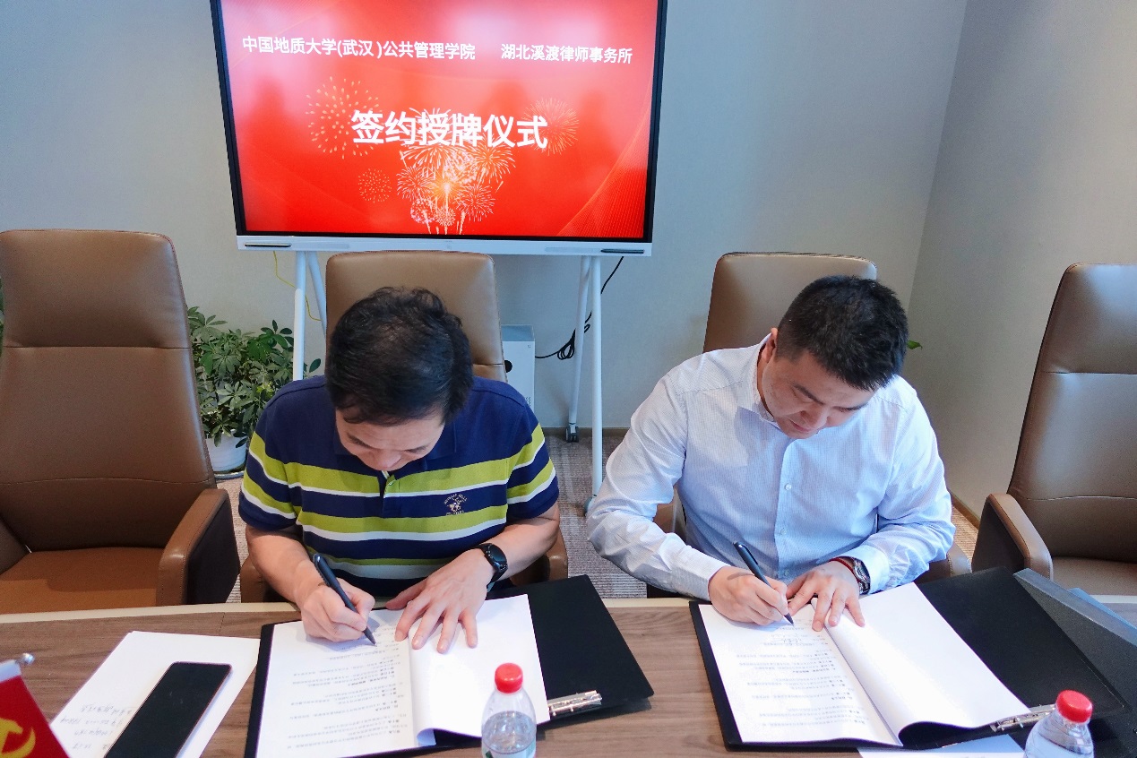 炎炎日正午,灼灼火俱燃。中午12时,签约授牌仪式正式启动:张宽裕书记和谢雄峰书记来到签约台就坐,分别代表地大best365英国体育在线与溪渡律师事务所签署了《合作协议》。