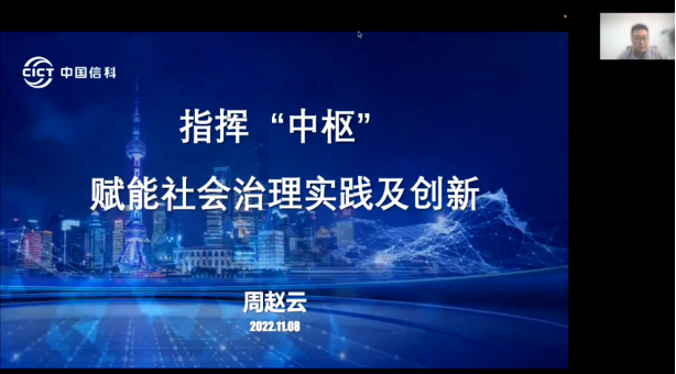 中国电信科学技术第一研究所副总经理、高级工程师周赵云作题为指挥“中枢”赋能社会治理实践及创新的报告。他结合实际案例和行业实践经验介绍了社会治理的发展背景和行业背景、社会治理当前存在的问题、指挥中枢的探索。他指出,社会治理的发展要健全社会治理体系,健全“共建、共治、共享”的社会治理制度。他认为,目前城市的常态化运营和突发事件管理之间缺乏高效、统一的社会治理机制,指挥调度产业的发展需要满足多样化的社会治理需求,指挥“中枢”应包括数据引擎、智能引擎和指令引擎,数据引擎融合、处理、共享数据,智能引擎提供数据综合分析以及决策辅助,指令引擎应实现高效指挥调度。他强调融合三大引擎才能真正实现跨领域、一体化、智能化的社会治理。