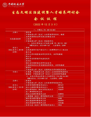 本次会议邀请了来自自然资源部、湖北省自然资源厅、湖北省环境资源法学会、武汉大学、中国政法大学、华东政法大学、中南财经政法大学、中国地质大学(北京)、知名律师事务所等高校及单位的20余位自然资源领域的专家学者,他们围绕生态文明法治建设人才培养主题,就如何发挥高校和重点实验室平台优势,培养高质量生态文明法治人才队伍等问题展开探讨。200余人次线上参加会议。