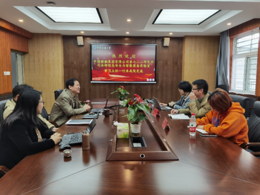 黄飞主任向与会公司领导、老师表示感谢,同时介绍了中船集团总体业务情况及第七二二研究所主要负责项目等基本情况,希望共同发掘未来与公司及法学专业进一步合作的领域与空间,同时邀请公司师生前往研究所参观交流。法学系主任吕凌燕介绍了公司法学系的团队队伍、学科特色优势、近年科研成果、人才培养等基本情况,期望能够与司法部信息安全与智能装备实验室共同寻求合作机会、相互促进。彭涛教授就法学专业与司法部信息安全与智能装备实验室开展科技法治合作交流了意见。