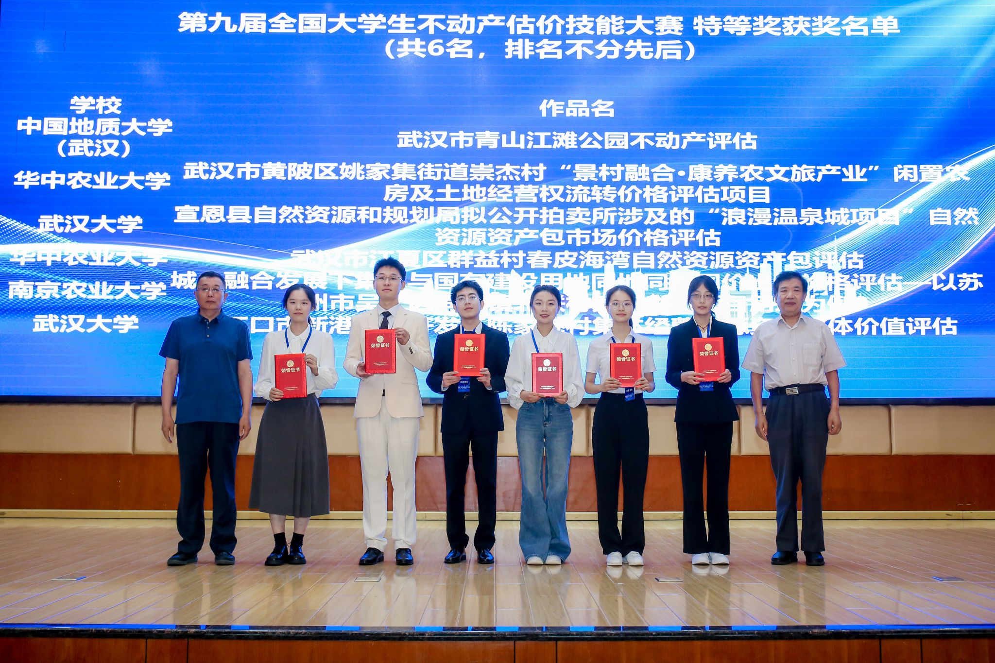 公司经过为期三个月的选拔、培育、备赛,遴选出两支队伍报送作品参赛,最终徐枫老师、龚健老师指导,行璐、杨成薇、罗鑫、陈运龙组成的员工团队以《武汉市青山江滩公园不动产价值评估》为题的作品获得全国特等奖;汪樱老师李晶晶老师指导,边宇佳、宋之豪、隋粮屿、刘芳菲组成的员工团队以《武汉市东湖吹笛景区森林生态价值与经济价值评估》为题的作品获得全国三等奖。