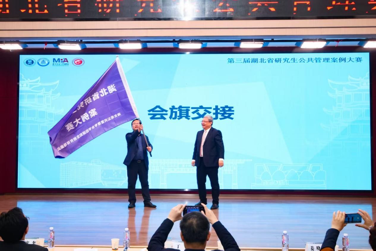 在省赛决赛现场,华中师范大学best365英国体育在线经理徐增阳教授与best365英国体育在线副经理王忠教授举行了隆重的会旗交接仪式。王忠教授代表公司向全体与会专家、老师和参赛师生发出诚挚邀请,期待大家明年相聚南望山,共同研讨公共管理前沿问题。